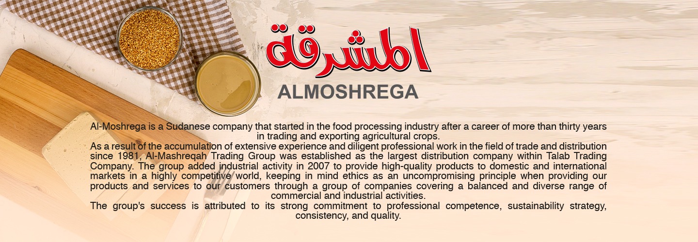 Al Moshrega is one of the Sudanese Companies that started in the filed of completion food products sections. We started since 2007 and up to now we are growing stably in the Sudanese & global market also we established in 2012 our new huge and modern industrial complex building located in the White Nile State, Kossti City 300 KM south Khartoum, Sudan which considering as one of the largest grain produce city in Sudan and which also has a dry port, this complex building is providing a very realistic push and support to our group of companies.